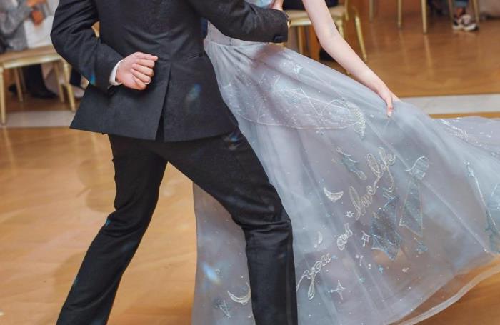 6月27日,张若昀唐艺昕婚礼现场的照片曝光,唐艺昕和张若昀跳舞时穿的礼服被绣着二人的情侣纹身,甜蜜细心的设计甜翻众人。有一行英文,写着:“love you as love life”,是两人共同纹在脚踝的情侣纹身,