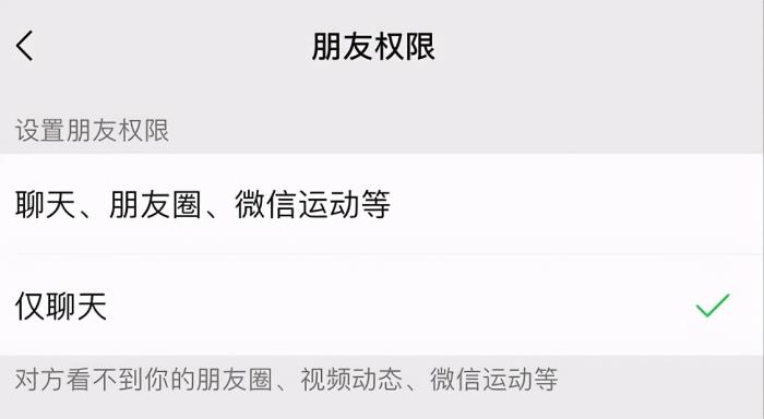 当你为微信好友设置好友权限时,对方将看不到你的朋友圈、微信动态以及视频相关的动态信息。如果有一天你遇到一个朋友没有给你看这些内容,说明他可能已经给你设置了“只聊天”的好友权限。
