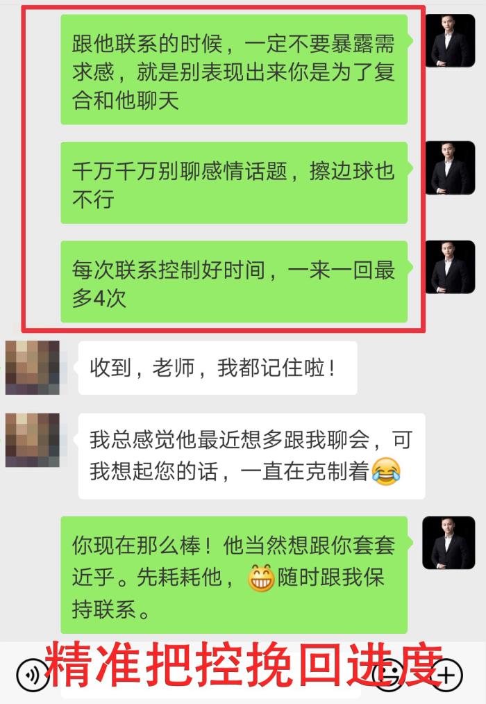 因为之前小敏和男友已经建立了"朋友关系",所以在帮助她全面提升的同时,导师还一直协助小敏和男友保持着适度的联系,通过"话术提炼+实时代聊"的方式递进她与男友的亲密关系,一步一步软化男友的心防。