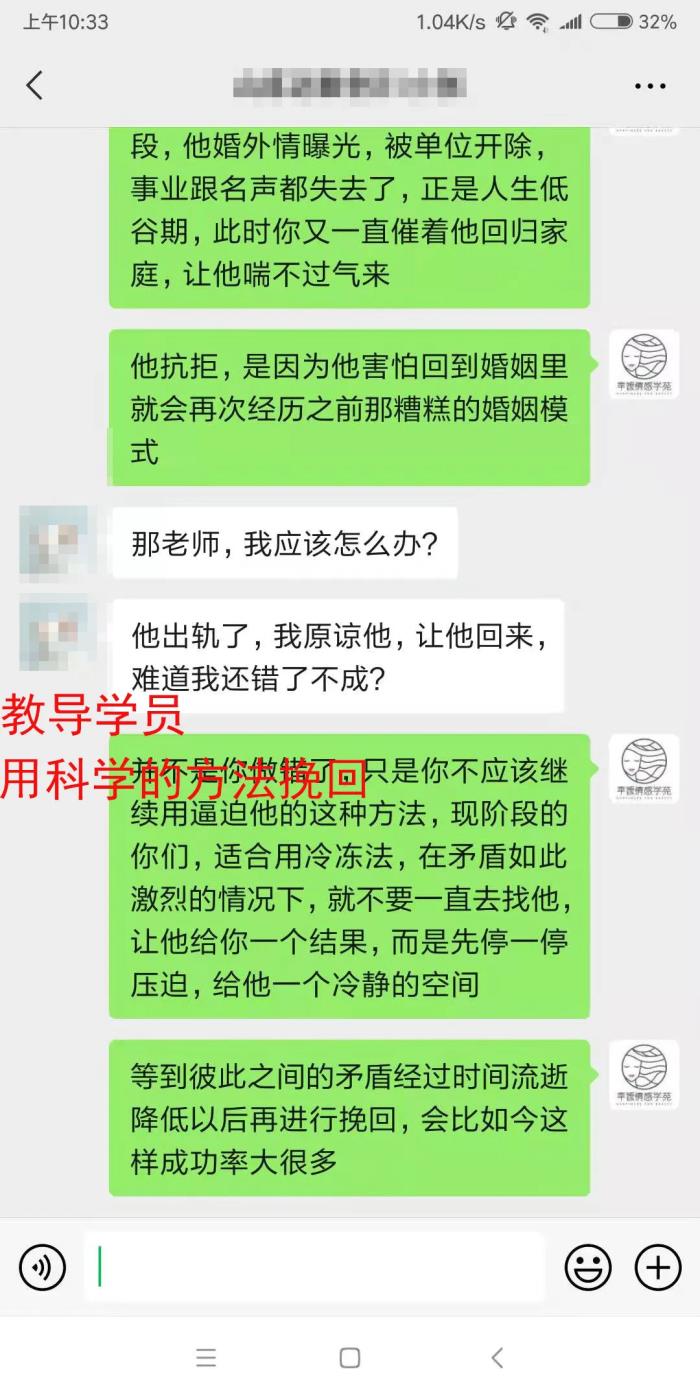 来访者在让家人跟目标谈心的同时,也可以跟家人一起给第三者制造危机感,击退第三者。通过了解,赵彬老师发现第三者极会给目标提供情绪价值,在微信中嘘寒问暖,互诉衷肠,让目标愿意为她放弃一切,这样的第三者属于高段位第三者。