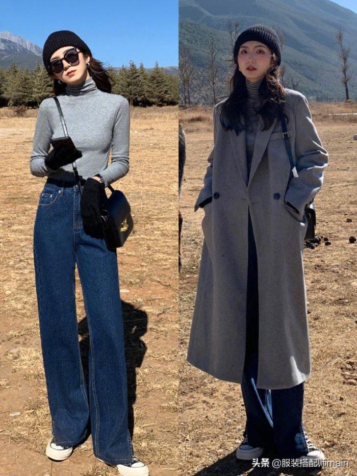 如图中示范,模特以灰色高领打底衫搭配高腰牛仔裤,简洁搭配气场十足。