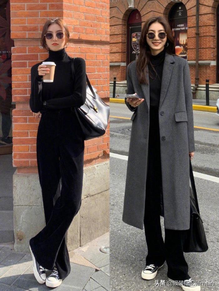 比如以黑色打底衫搭配灰色西装大衣,深色调穿搭更显成熟稳重,别有一番御姐韵味。