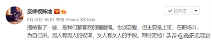 反裤衩阵地就转载官宣微博,给大家对该剧质量的担心打了保票。承诺虽然有谈恋爱,但主要是上班,就讲在职场斗。并且全是为自己拼,男人有男人的权谋,女人有女人的手段。由此可见,这是一部各自精彩,不身披职场外衣,专心谈恋爱。而是工作之余,谈个恋爱放松一下心情的走心职场剧。