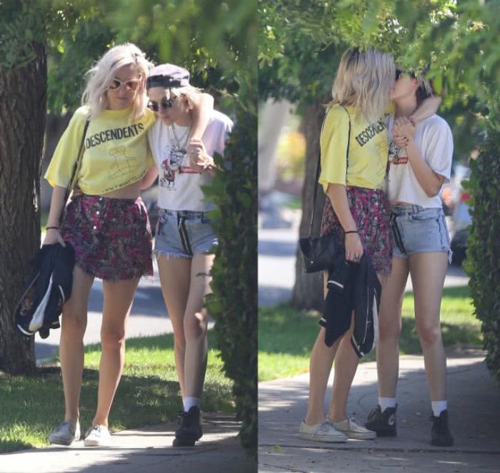 当地时间26日,小K和作家迪伦·迈耶在洛杉矶街头散步,她们都穿得比较清爽,同时也都展示了比较纤细的双腿。情到深处还站在树荫下大秀甜蜜。