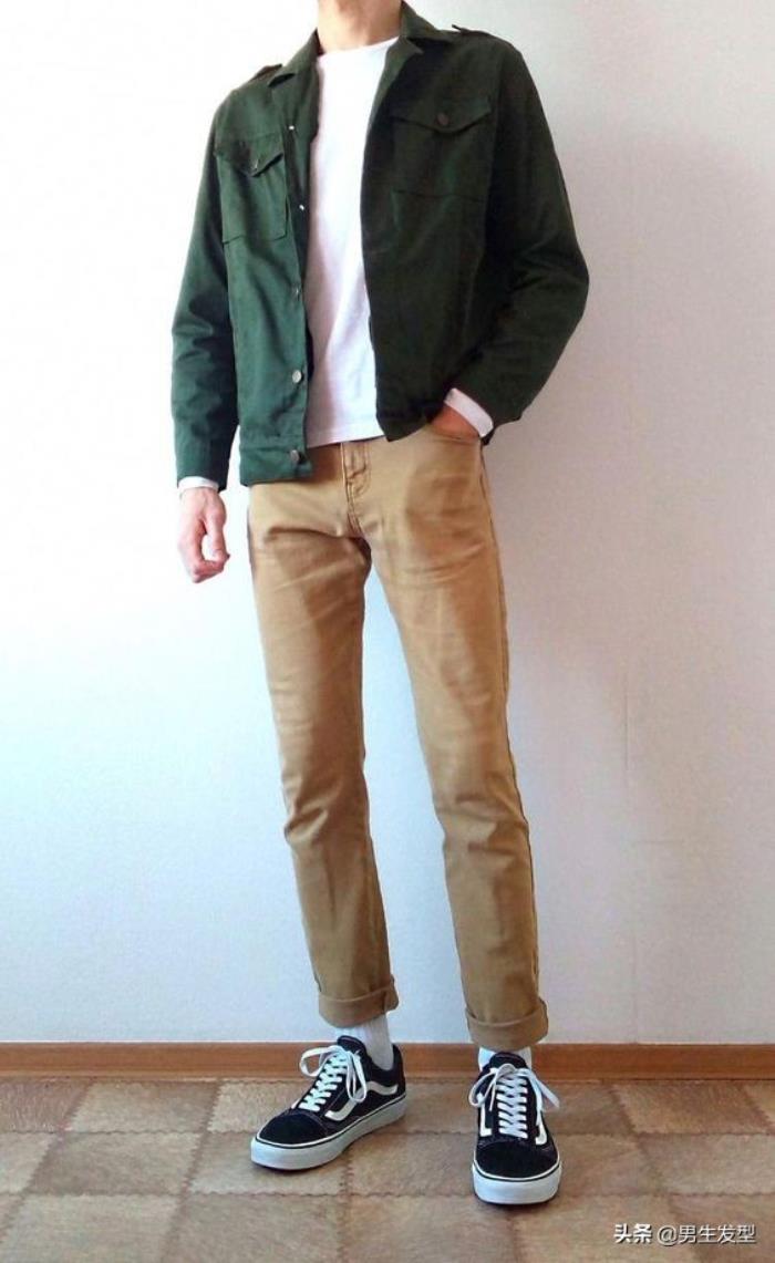 有些同学在比较南方的地方,就不太需要很厚的衣服,一件夹克就可以了。军绿色的外套搭配白色的T恤,搭配卡其色的裤子,是一套很适合男孩子的搭配,显帅显白,还很显身高呢!