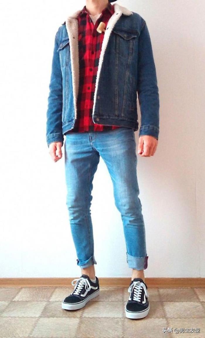 牛仔套装也是很适合男生的搭配,不需要过多的搭配技巧。套装永远是不会过时的时尚搭配,而且比较百搭,可以选择一件红黑相间的格子衬衫,充满时尚的魅力!