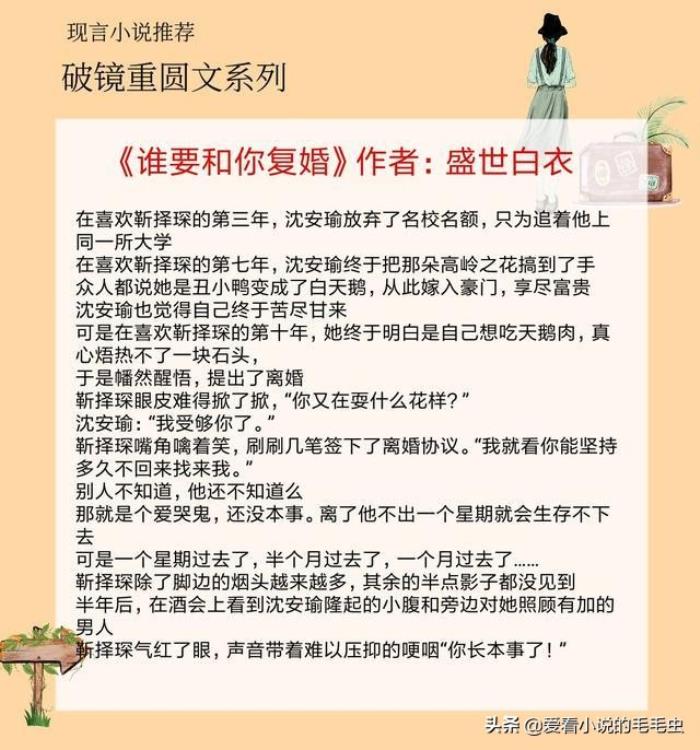 书评:破镜重圆文,沈安瑜在喜欢靳择琛的第七年,终于如愿以偿的成为了靳夫人。可是在嫁给他的第三年后,沈安瑜发现原来他们的婚姻只不过是他用来争夺股权的工具,于是潘然醒悟提出了离婚。男主得到了公司,