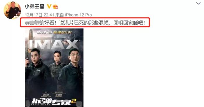 香港知名导演王晶在看完《拆弹专家2》之后兴奋不已,让说那些港片已死的人闭嘴回家睡觉,而他自己从2019年起就疯狂产出“情怀大片”,包括但不限于《唐伯虎点秋香2019》、《新河东狮吼》、《新六指琴魔》、《新倚天屠龙记》、《孙悟空大战盘丝洞》……