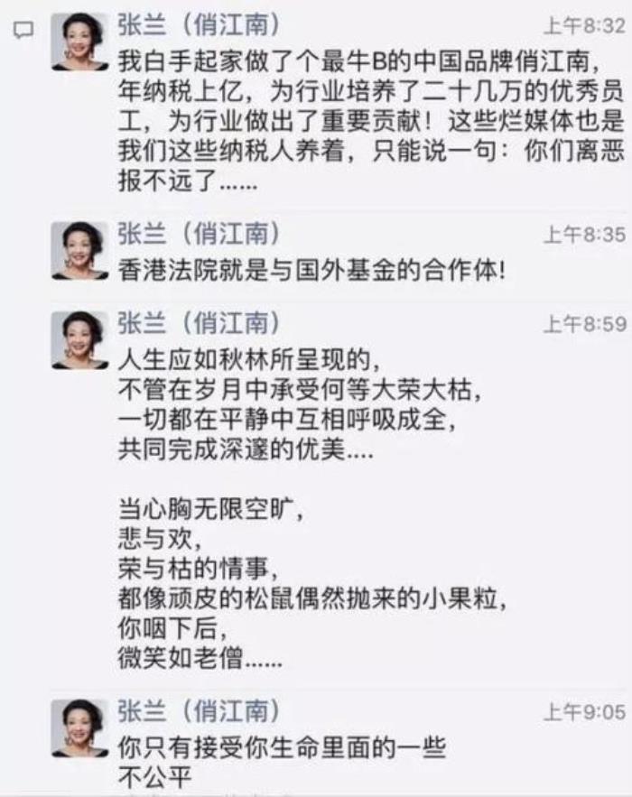 除了律师发布声明外,张兰本人亦在朋友圈发飙:“我白手起家做了个最牛B的中国品牌俏江南,年纳税上亿,为行业培养了二十几万的优秀员工,为行业做出了重要贡献!这些烂媒体也是我们这些纳税人养着,只能说一句:你们离恶报不远了……”,并表示香港法院就是与国外基金的合作体。