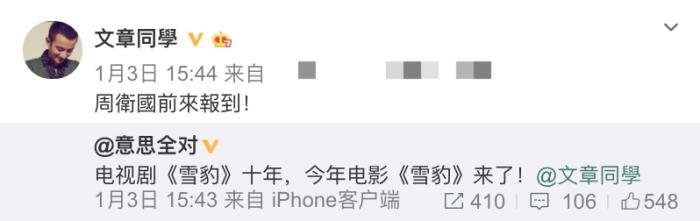 1月3日下午,电视剧《雪豹》的制片人、编剧张健发文,宣布今年将出《雪豹》电影版,还提到了文章。随后文章本人也转发博文,令不少人纷纷猜测,难道电影版的男主,也是文章来演吗?