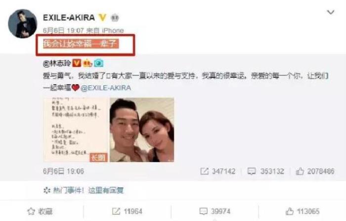 本来,这样的事情,或许是没有答案的。但是,有些东西,或许是可以通过一些细节展现出来的。比如,在林志玲公布这样好消息的时候,黑泽良平也是及时地转发了,并且表示:“我会让你幸福一辈子。”这样的话语,或许就是最动人的告白了。然后,这样的话语若能做到,对林志玲来说,一辈子也就是值得的了。因为,对女生来说,遇见一个这样承诺的人,是不容易的,而若是能做到,自然是更好的了。