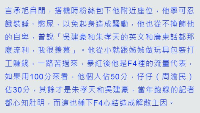 此外,言承旭毫不掩饰自卑感,贫寒出身的他,羡慕F4成员吴建豪、朱孝天的英文和广东话流利,又自觉配不上林志玲,说林志玲太可怕,EQ高、没情绪、学历高又有气质,总是笑脸迎人,他自己无法做到表情管理,一生气全世界都看出来。