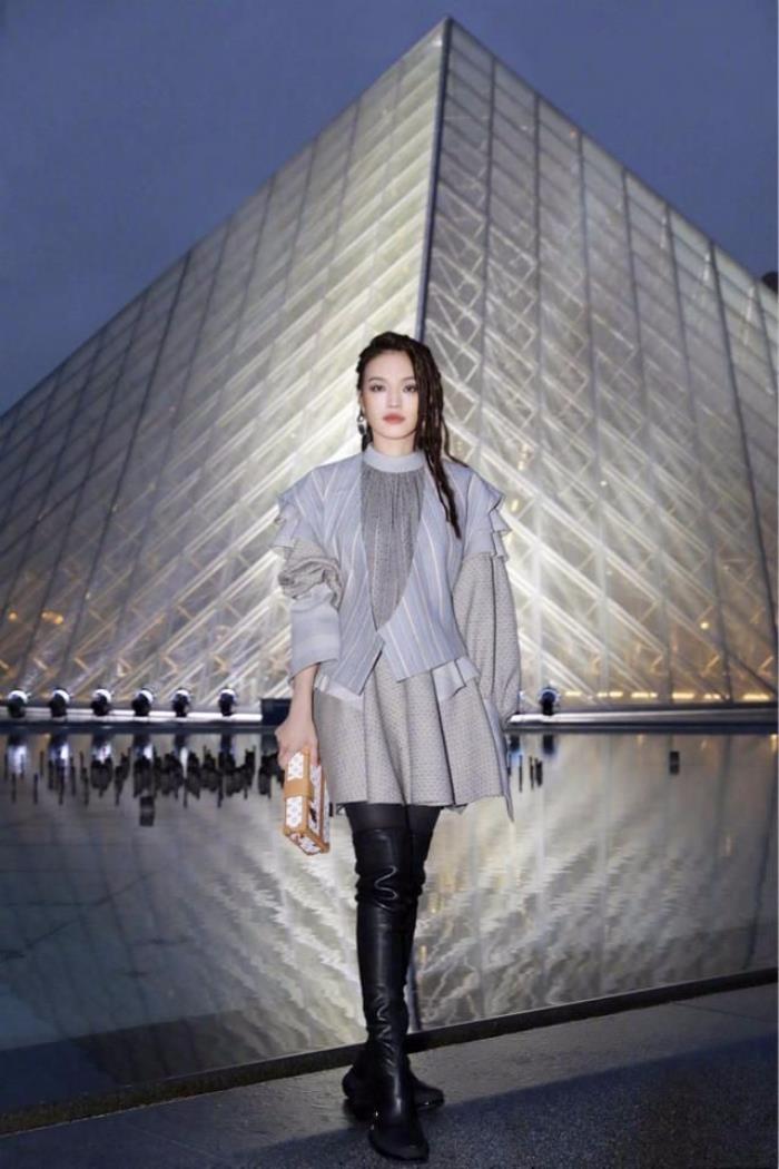 女神舒淇时不时也要来一点酷炫风。她头上扎着一条一条的小脏辫,露出饱满的额头,上身的外套非常有设计感。层层叠叠的布料,非常独特。