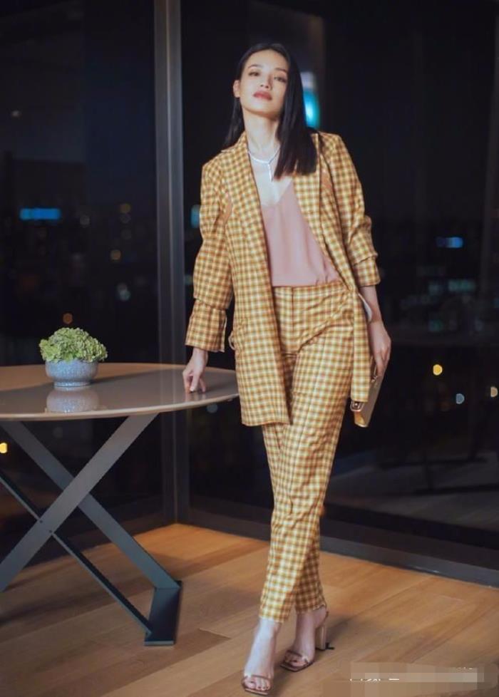 你想要做一个非常时尚的职场女性吗?那么你就可以学舒淇这样的穿搭。舒淇的内搭是一件肉粉色的吊带背心,微微的露出一点点胸了,非常性感,再配上外套黄色格纹的西装,太好看了。