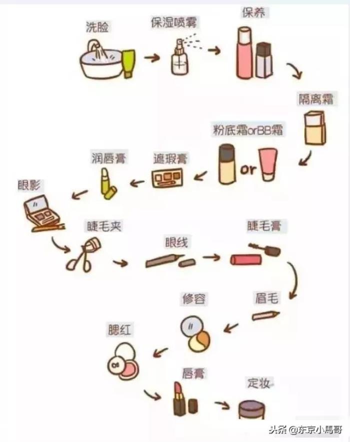 这张图即告诉了我们护肤顺序,也让我们了解到了正确的化妆顺序! 洁面 → 保湿 → 保养 → 隔离 → 粉底 → 遮瑕力 → 润唇 → 眼影 → 夹睫毛 → 眼线 → 睫毛膏 → 眉毛 → 修容 → 腮红 → 唇膏 → 定妆。