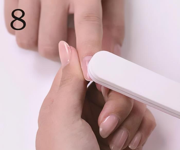 包边:先用底胶在指甲前缘包边,即从前缘一侧刷至另一侧,然后反方向再来一遍