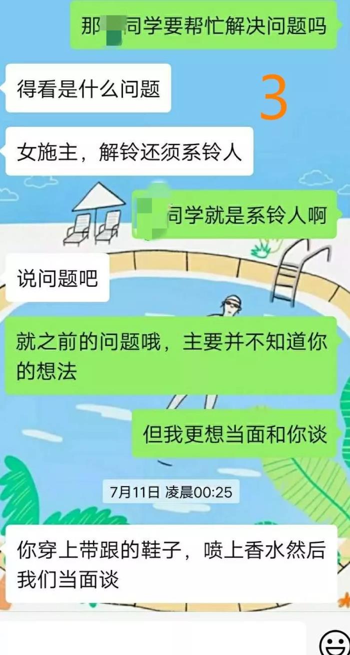 在聊天记录里,他说:“你穿上高跟鞋,喷上香水,我们就面对面聊。”
