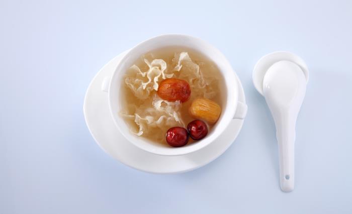 银耳10~12g,冰糖适量。将银耳一朵一朵洗净,放入碗中用冷开水浸泡,水应浸过银耳,浸泡1小时,待其发胀后,拣去杂物。将浸泡后的银耳,再加冷开水和冰糖适量,放入碗中。将碗放入蒸锅内,隔水蒸炖2~3小时。服用时,饮汤、食银耳。