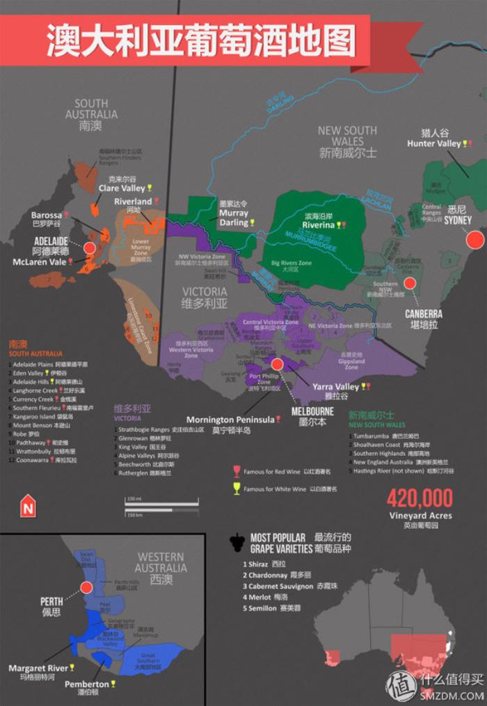 从上图可以看出其实适合种植葡萄酒的土壤,绝大部分位于澳大利亚南部,而且只占国土的极小一部分,那么很多人就可能会想了,澳洲葡萄酒可能也就那么几种?没什么可喝的?