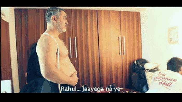 阿米尔·汗在影片中的角色跨度大,从健硕的摔跤高手到大腹便便的教练老爸。