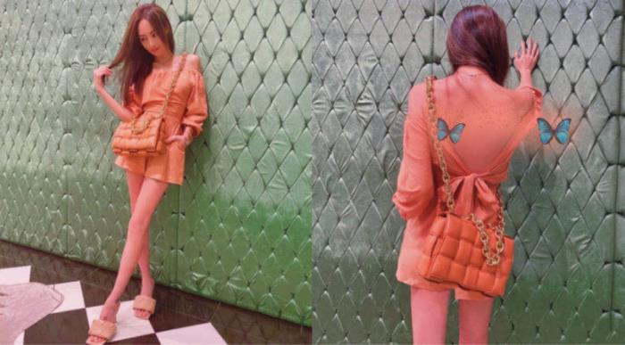 关颖日前晒出近照,以“同色控”穿搭来拯救显黄橙色装,她穿着肤橘色露背连身裤,搭配BOTTEGA VENETA(简称BV)陶土红Chain Cassette编织小羊皮卡带包及裸肤色Lido高跟鞋,连飘逸秀发都染上了相同色调,让她得意发文标注「Hair color matching」(发色也搭一块)。