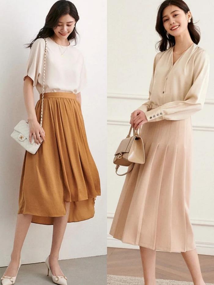右边这件米色v领衬衫做工细致,结合垂顺光滑的材质,更显高贵大方,搭条同色系高腰百褶过膝裙,轻松打造好气质。