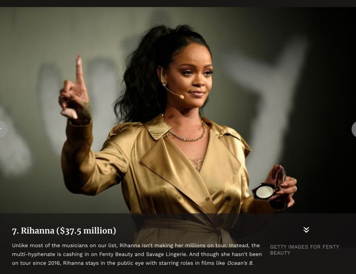 蕾哈娜已是乐坛老将,不过她对开全球演唱会并不热衷,倒是代言Fenty Beauty等品牌上获利颇丰,还出演了电影《瞒天过海:美人计》,过去一年收入3750万美元。