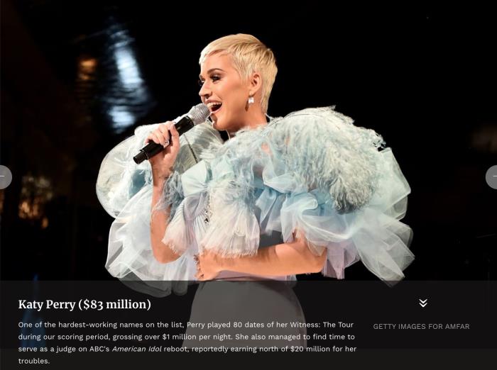 但是,今年最大的赢家不是榜首常客霉霉,而是水果姐凯蒂 佩里!她过去就干了一件事儿,就是巡演,一下子来了80场,平均一晚上赚100万美元,加之其它收入,这一年,终于以8300万美元的收入登顶!