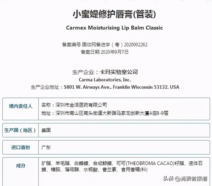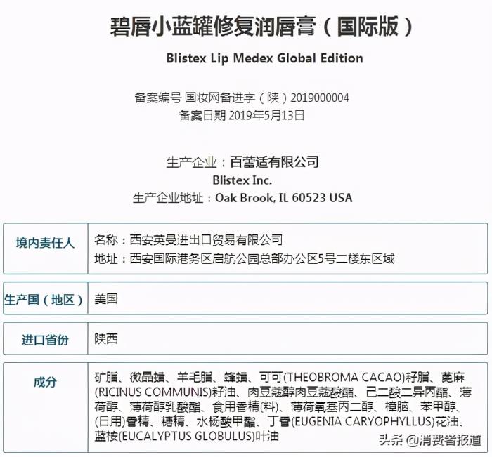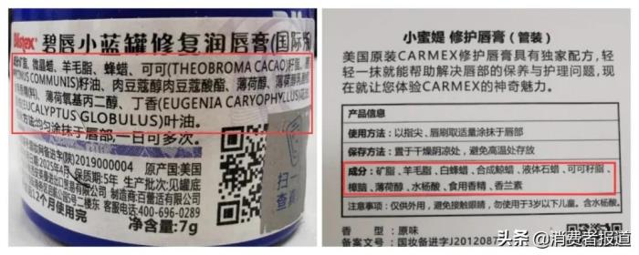 而Carmex小蜜媞修护唇膏(管装)、Blistex碧唇小蓝罐修复润唇膏(国际版)两款进口产品含有我国禁用物质苯酚却顺利通过备案,其中或存在瞒报违法行为。