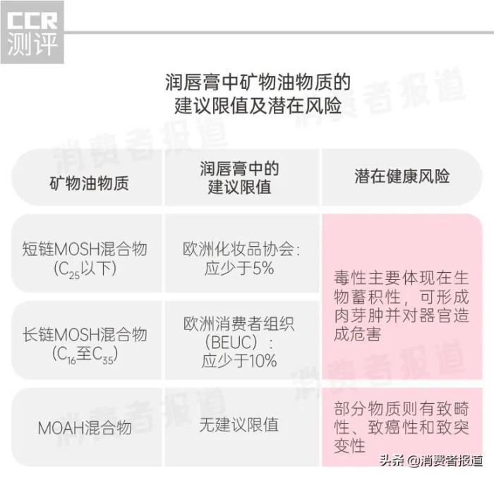 欧洲消费者组织(BEUC)在2017年11 月提出建议,认为润唇膏中所含的长链MOSH混合物(碳分子数量由C16至C35范围)应少于10%。
