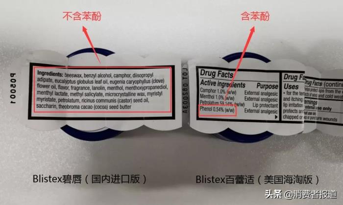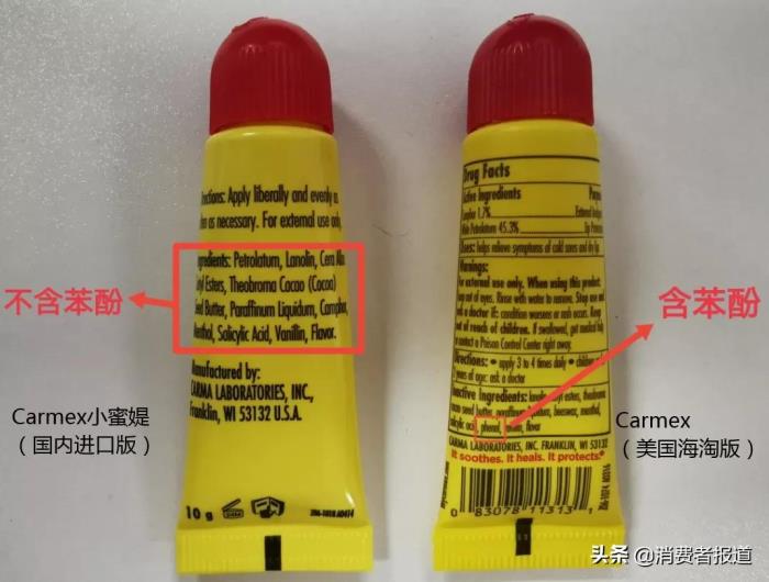 两种版本因销售渠道不同,中文译名也不甚相同。不仅名字不同,对外宣称的成分也有差异。美国原版的两款润唇膏标签显示含有苯酚,而国内进口的两款产品标签以及备案信息则均显示不含苯酚。