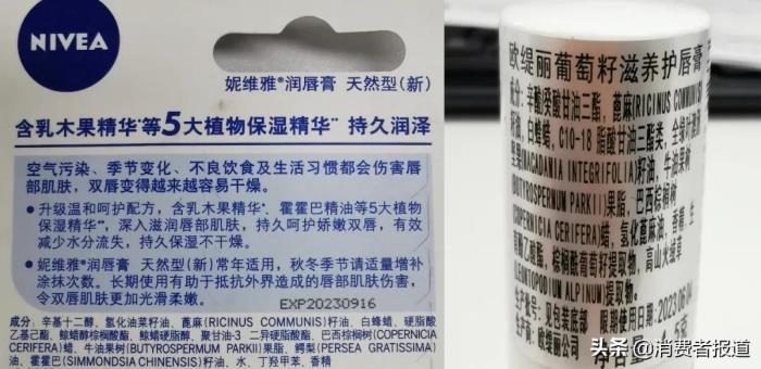 12款润唇膏中,仅妮维雅、欧缇丽2款不含上述矿物油成分。