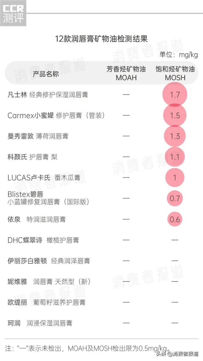 而凡士林、Carmex小蜜媞 、曼秀雷敦、科颜氏、LUCAS卢卡氏、Blistex碧唇、依泉等7款检出一定量饱和烃矿物油MOSH。