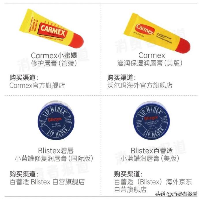 在此次检测的润唇膏中,知名度较高同时十分受消费者喜爱的Carmex、Blistex两款产品分别有两个版本,一种是在国内有进口备案的Blistex碧唇小蓝罐修复润唇膏(国际版)、Carmex小蜜媞修护唇膏(管装),在国内有代理商和官方旗舰店。
