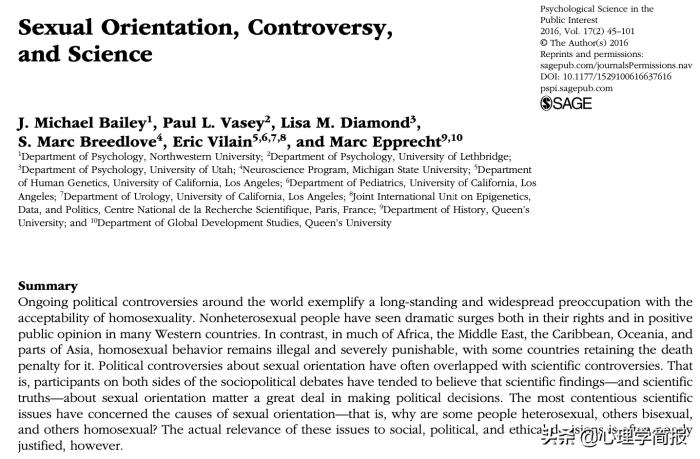[1] Bailey, J. M., Vasey, P. L., Diamond, L. M., Breedlove, S. M., Vilain, E., & Epprecht, M. (2016). Sexual Orientation, Controversy, and Science. Psychological Science in the Public Interest, 17(2), 45–101.