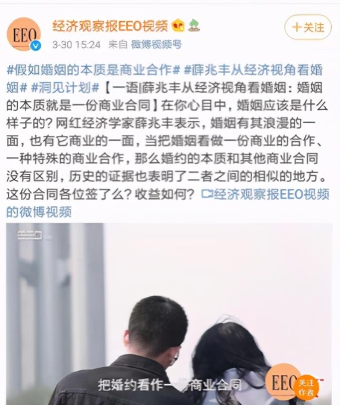 近日,经济学家薛兆丰在网上名人说:婚姻的本质就是一份商业合同。