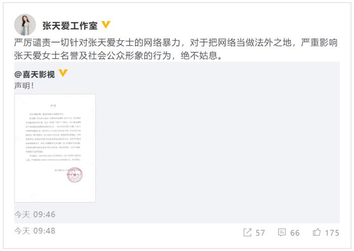 张天爱工作室转发了这条微博并表示:“对于把网络当做法外之地,严重影响张天爱女士名誉及社会公众形象的行为,绝不姑息。”声明中的“某业内人士”,指的就是江疏影经纪人,看来要正面开撕了。