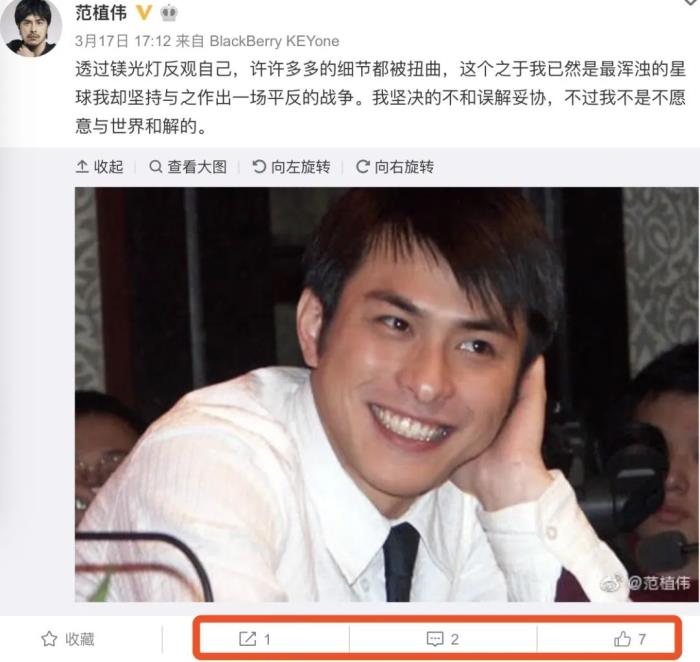 日前,他无故重提与王心凌的旧事,转发了一条视频网址,内容是有关王心凌初夜一事,既不认错,更似心有不甘。他写下:“不该承担的千万不要,偷鸡不着蚀把米。”不过,他的行为已经无法再引起网友兴趣,这个帖子放了两天也仅有两条留言,其中一则更是他自己留下:“据理力争。”