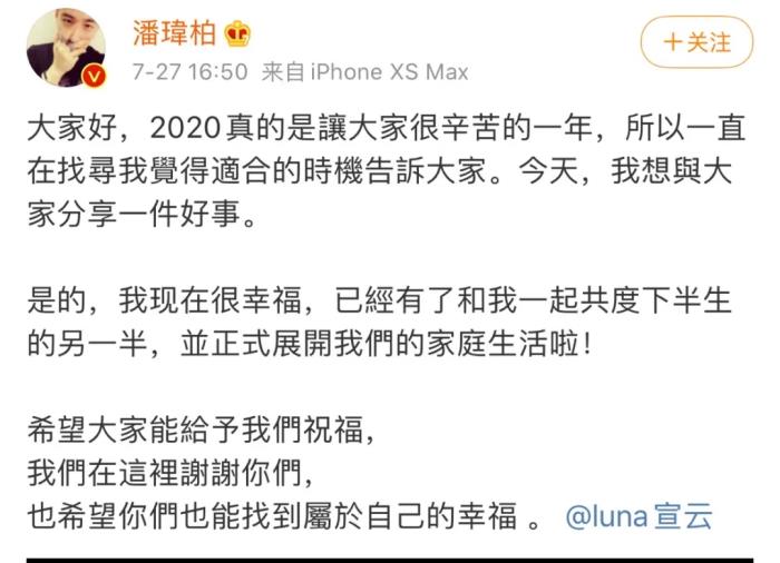 而且是自己在微博上直接宣布的,不是宣布恋情,直接宣布了结婚,并且@了自己的老婆。
