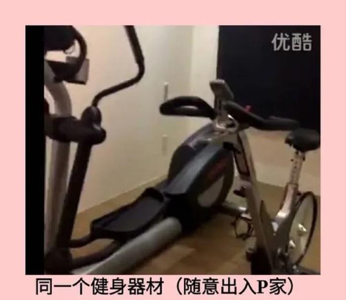 女方在男方家里的健身房自拍对比,地板、墙壁、健身器材,连墙上的两个插座都一摸一样。