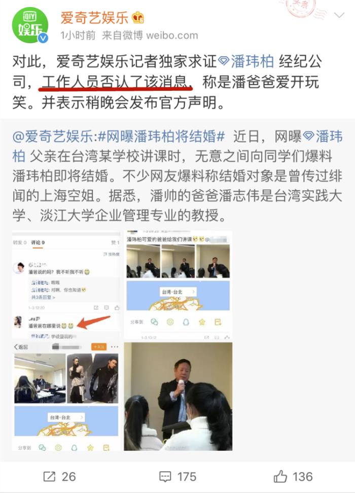 有意思的是,今年1月份,潘玮柏的爸爸上课的时候还爆料过潘玮柏将要结婚。说表示稍晚后会发布官方声明。但是也被潘玮柏否认了。