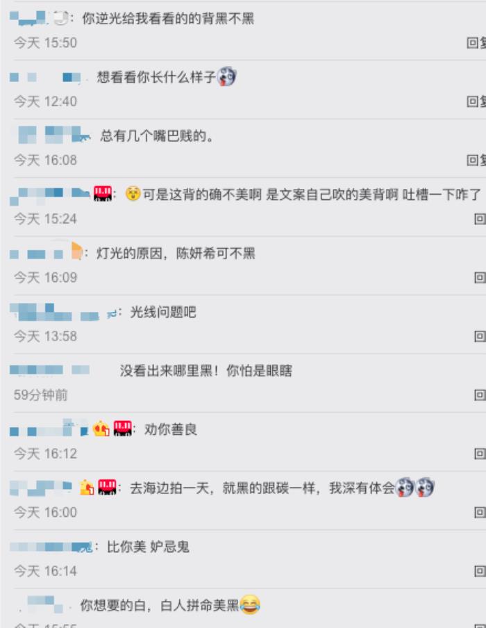 但其实可能是因为拍照的角度和灯光问题,才会显得陈妍希的后背有些黑。一些网友也认为:逆光的原因,陈妍希可不黑。去海边拍一天,就黑的跟碳一样。