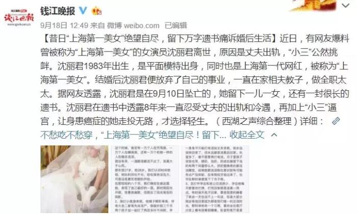 前段时间,上海女演员沈丽君在婚后放弃了自己的事业,做了8年全职妈妈,育有一儿一女。她的丈夫出轨了,她的学妹挑衅。她因癌症而绝望,跳楼自杀。