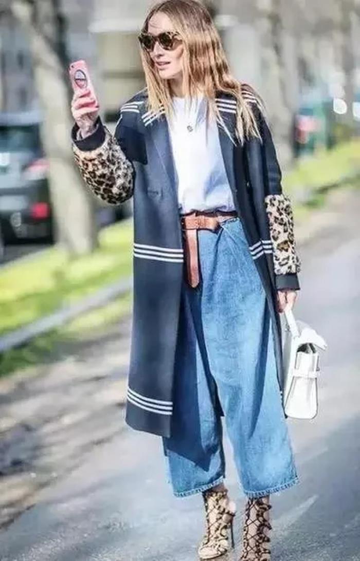 短款白色的上衣+牛仔裤,搭配风衣,可以拉长腿部线条!