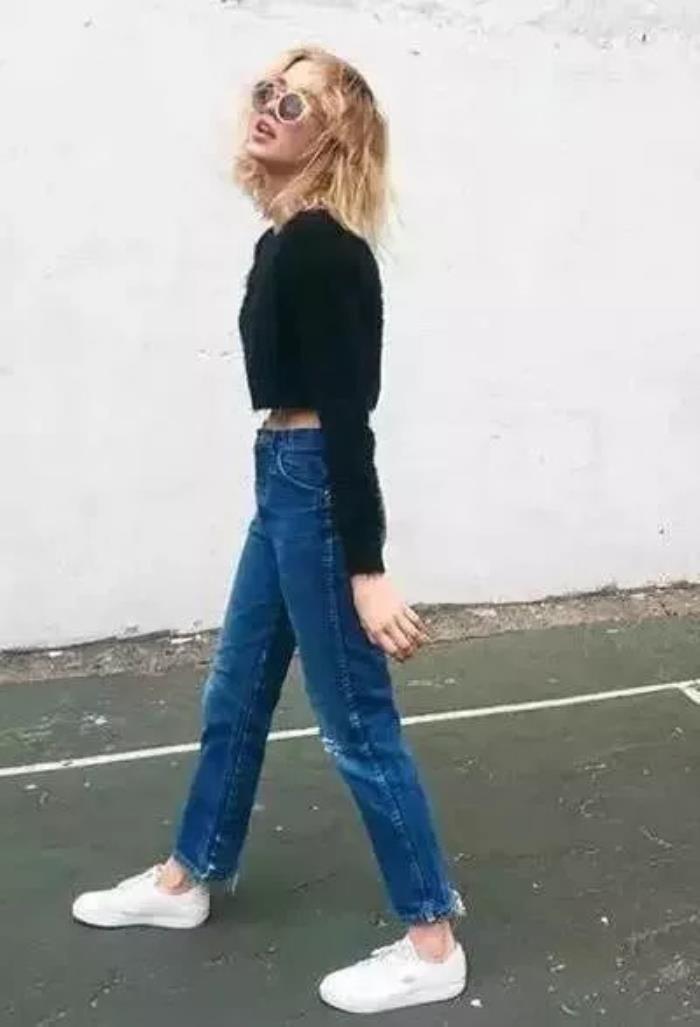 黑色短上衣搭配牛仔裤,配上厚底鞋,休闲简约。