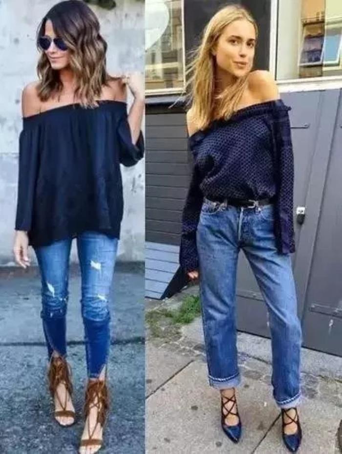 让你看看塞进去和不塞的区别,同样是一字肩上衣搭配牛仔裤,腿的长度对比一目了然!