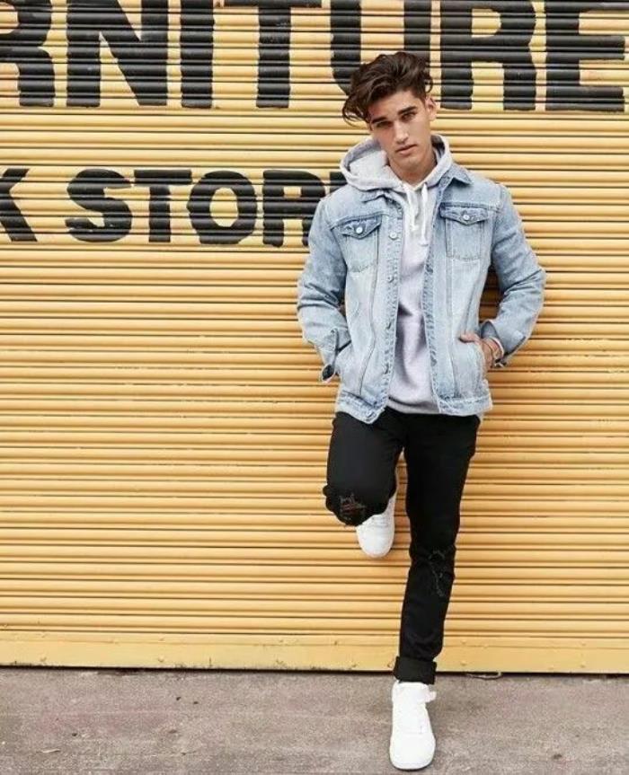 在牛仔夹克里面搭配连帽卫衣和衬衫,造型的层次感就显得很丰富,加上一条工装裤,文艺潮流的风调就很突出。