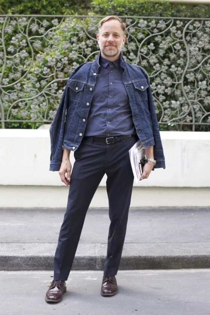 牛仔夹克和牛仔裤撞色如果牛仔夹克和牛仔裤都选用蓝色,那么搭配起来就更难把控,所以可以尝试撞色的处理,其中“上浅下深”的色调搭配就很值得推荐,而且这个配色适合大部分体型,对身材不会很苛刻。