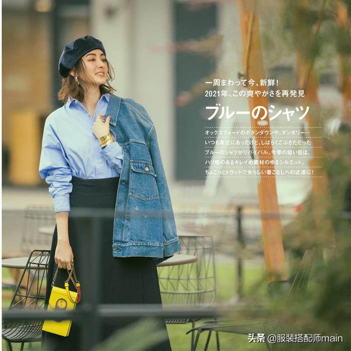 怕hold不住黄色的明亮感,也可以只把它作为下装来穿,黑色打底衫+黄色半身裙+蓝色牛仔外套,这身穿扮估计大部分女生都能驾驭。
