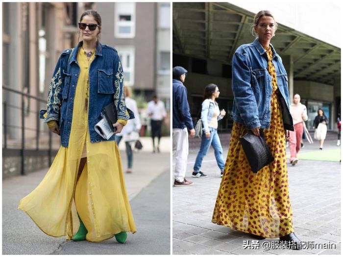 黄色长裙单穿容易显黄显黑,但是当它和牛仔蓝外套组合在一起,反而达到了一种默契的平衡。